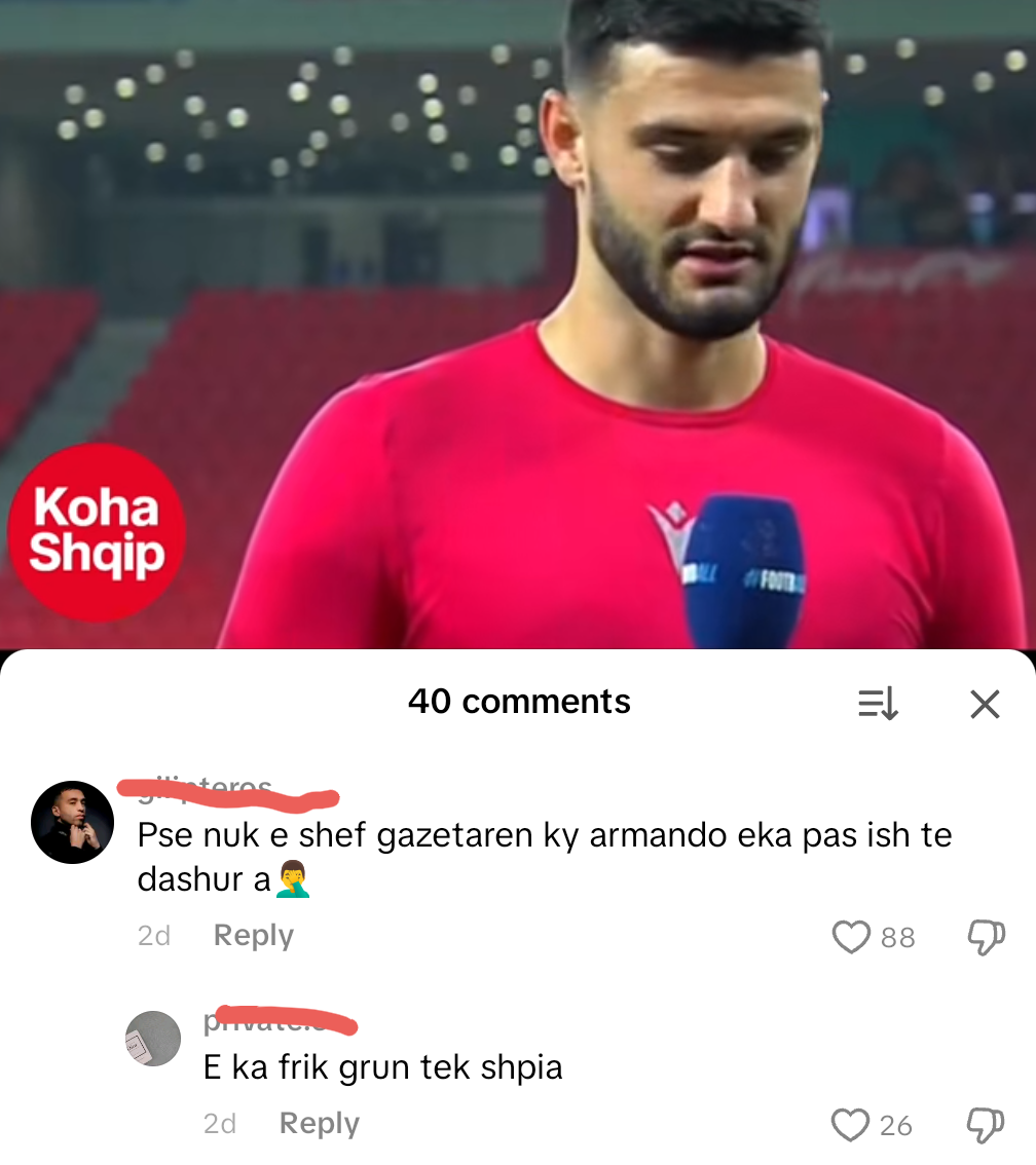 October 18, 2025Futbolisti i Kombëtares Shqiptare Armando Broja po bëhet viral me një qëndrim të tijin përgjatë një interviste pas ndeshjes me Jordaninë. Ai ka mbajtur një qëndrim e shikim të fiksuar nga fusha e blertë përgjatë krejt pyetjeve të moderators sportive Franceska Rustem, duke shmangur kontaktin me sy.