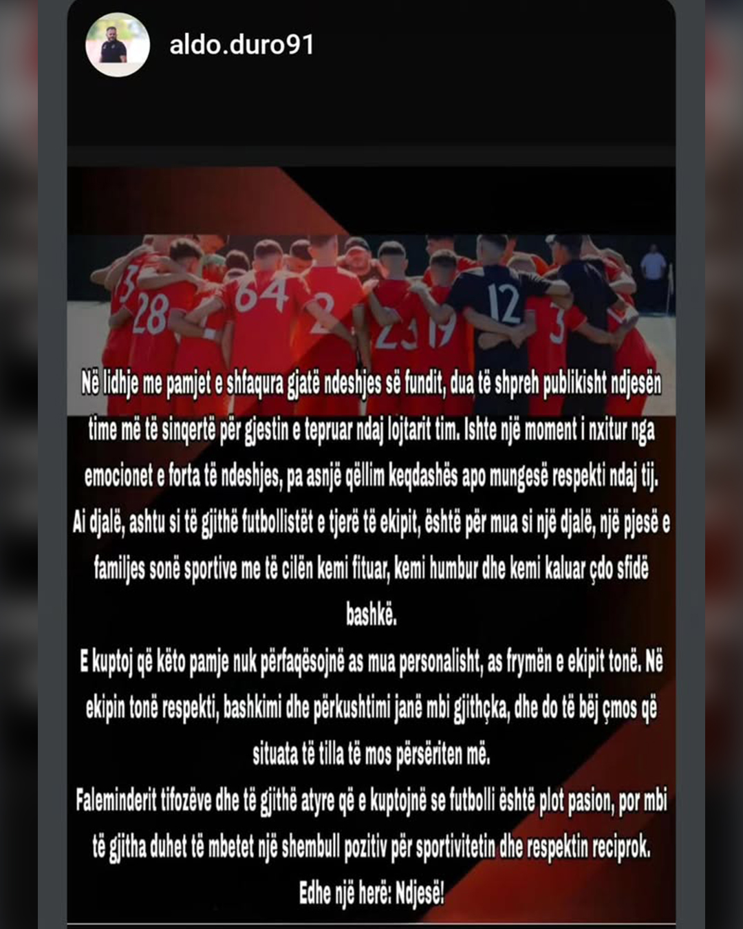 “E kuptoj që këto pamje nuk përfaqësojnë as mua personalisht, as frymën e ekipit tonë. Në ekipin tonë respekti, bashkimi dhe përkushtimi janë mbi gjithçka, dhe do të bëj çmos që situata të tilla të mos përsëriten më,” – vijon më tej Duro.