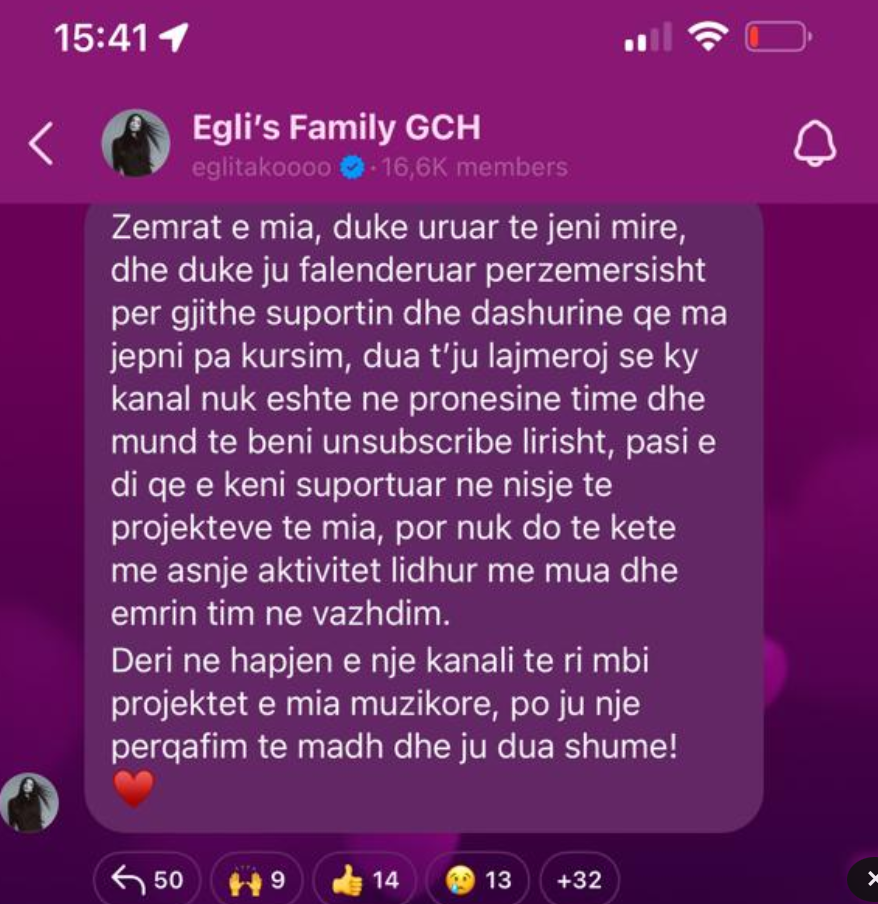 October 27, 2025Këngëtarja dhe ish-konkurrentja e reality show-t, Egli Tako, ka dhënë një njoftim të papritur në rrjetet sociale, duke njoftuar mbylljen e kanalit të fansave, i cili quhej “Egli’s Family GCH”, për shkak të problemeve me pronësinë.