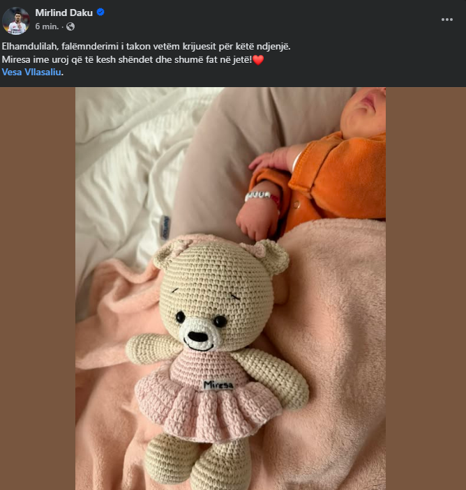 Krahas një fotografie ku shihet dora e vogëlushes së porsalindur, Daku ka shkruar: “Elhamdulilah, falënderimi i takon vetëm Krijuesit për këtë ndjenjë. Miresa ime, uroj që të kesh shëndet dhe shumë fat në jetë!”